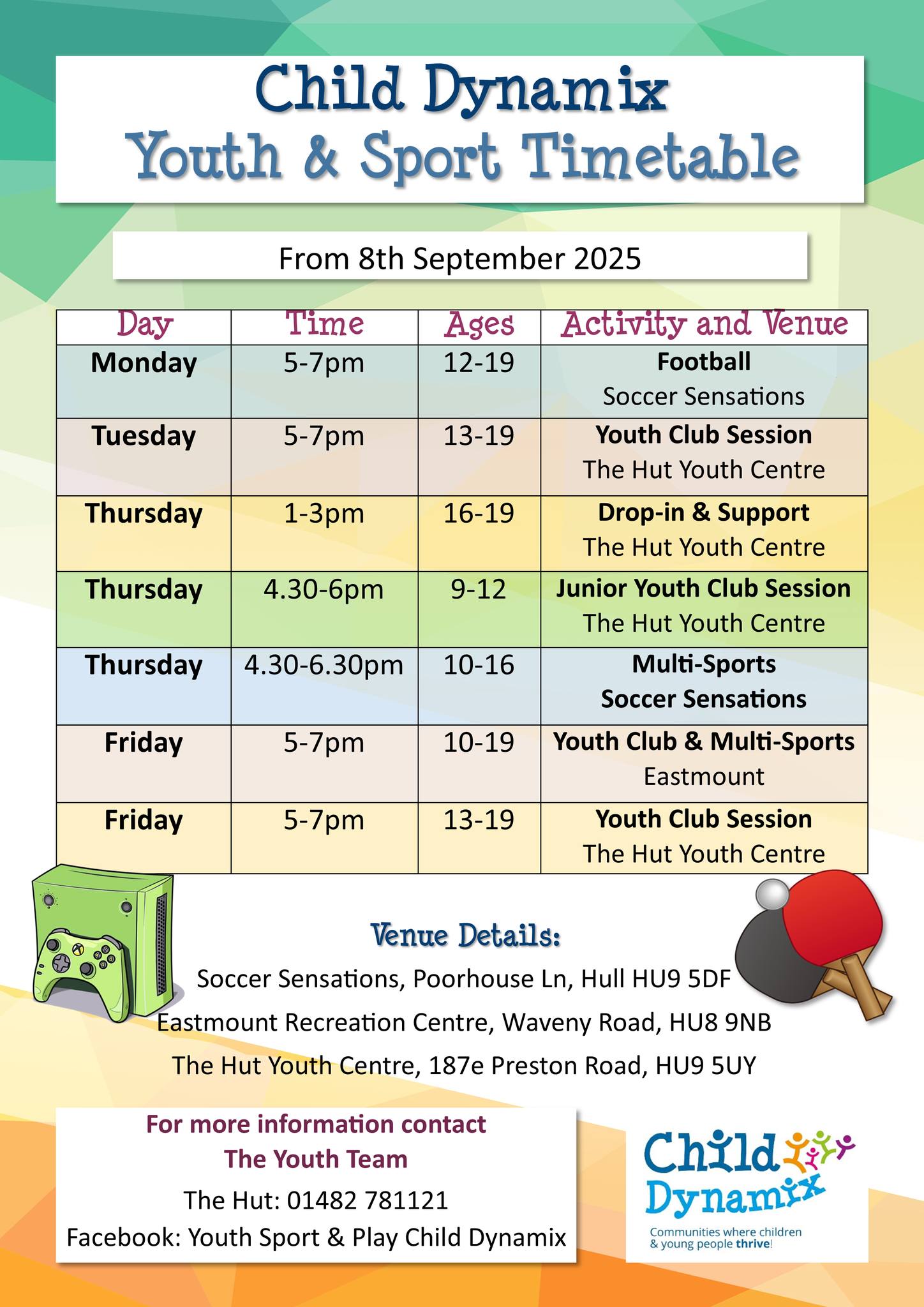 Here at the Child Dynamix Youth Team, we think everyone in Hull deserves to have a space where they can go to and have fun, learn some new skills, and make friends. We have a dedicated Youth Centre where we host a wide variety of sessions – from cookery and arts & crafts, to gaming and DJ-ing, and much more. Alongside these activities, we have 1-to-1 support available on a range of topics. Beyond this we also offer sporting sessions in locations across Hull. Read on to find out more about more about all the youth services we have to offer.